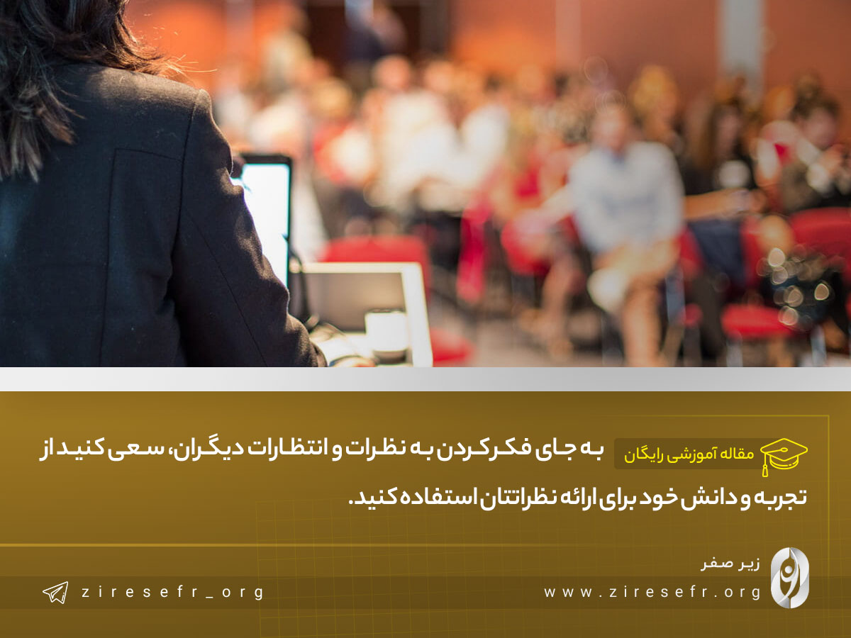 در مواقعی که در حال حرف زدن هستید، تمرکز خود را بر روی اطلاعات و دیدگاه خود نگه دارید. به جای فکر کردن به نظرات و انتظارات دیگران، سعی کنید از تجربه و دانش خود برای ارائه نظراتتان استفاده کنید.