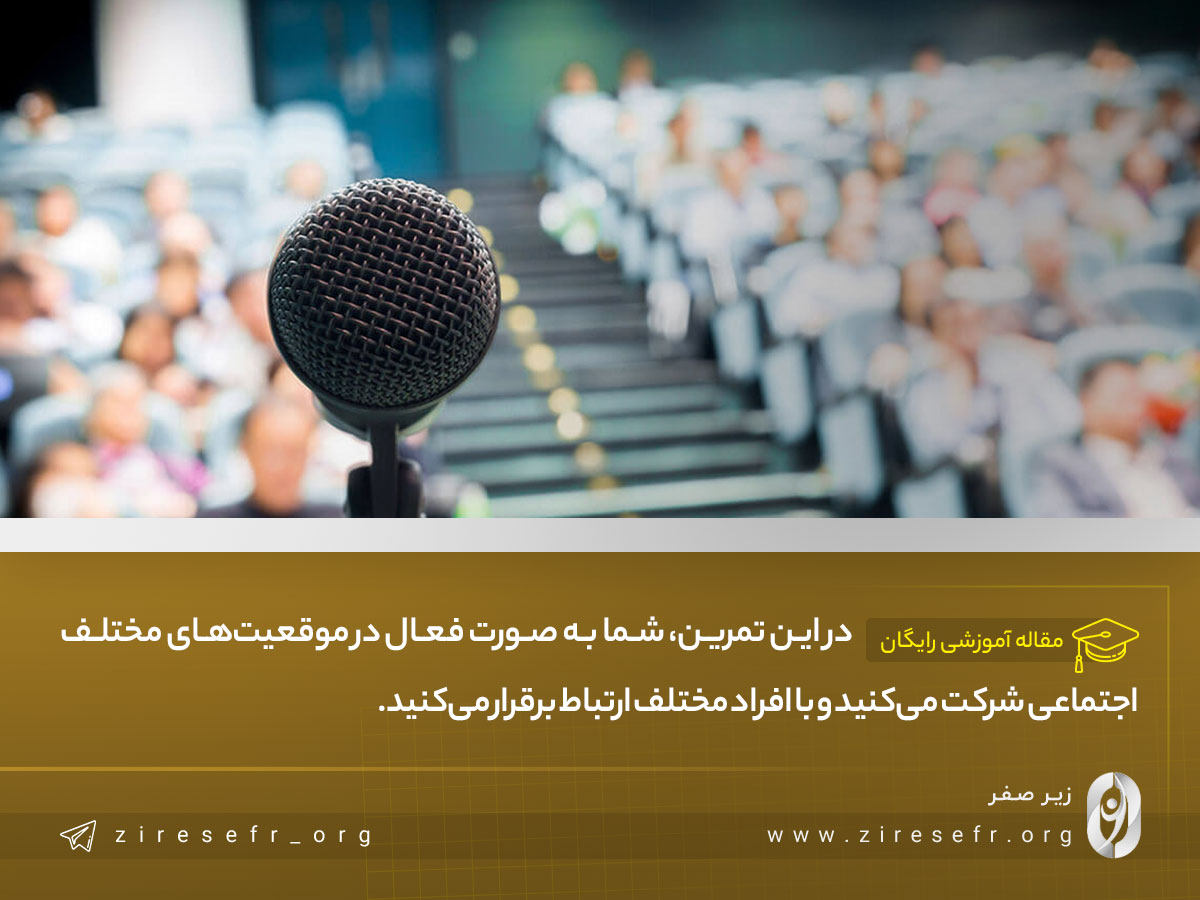 در موقعیتهای اجتماعی، شرکت فعال داشته باشید. این کار شامل شرکت در بحثها، ارائه نظرات، پرسش سوالات و شرکت در فعالیتهای گروهی است.